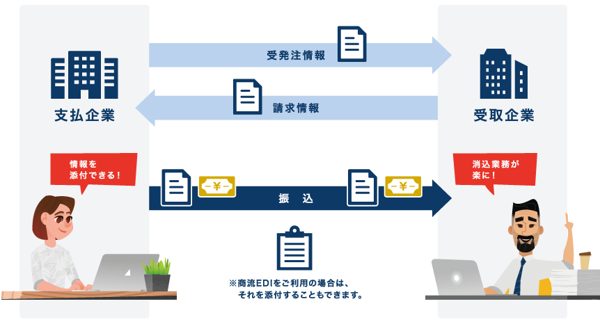 そのため1か月分の振込をまとめて行っても、受取企業では添付された各案件の明細によって売掛金の消込作業がスムーズに行えます。同時に支払企業の経理部門や営業への電話・FAX、メールなどによる問い合わせ・照会も不要になりますので、双方で業務の効率化を図ることができるわけです。
